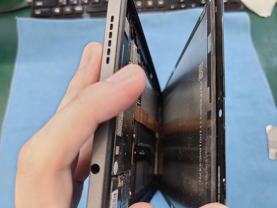 全体を剥がしたら、内部ケーブルに気をつけながら画面を手前に倒します。