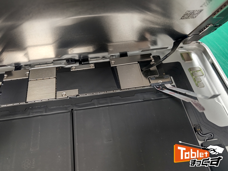 次に液晶を破損させないように慎重に持ち上げます。これで接続されたフレキケーブルやバッテリーにアクセスすることができます。