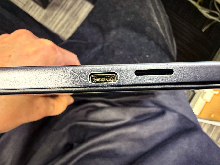 基板を外してUSB Type-Cの充電口部分を再度確認します。やはり、ピンがぐちゃぐちゃに潰れていますね、、