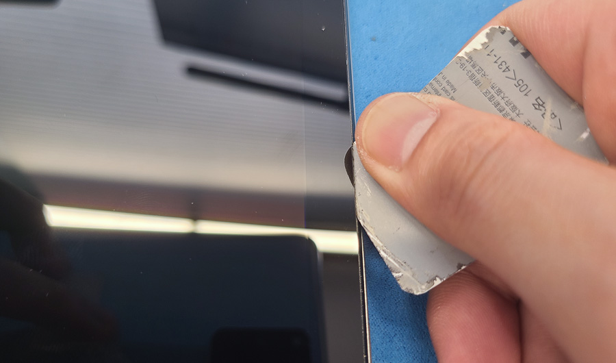 画面とフレームの角を合わせながら、ズレが無いようにゆっくり画面をおろして貼り付けます。