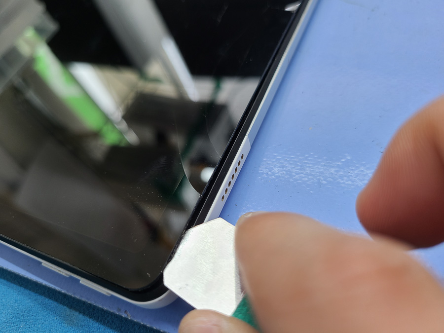 画面全体に熱を与えて接着を弱くしたら、ガラスとプラスチックフレームの隙間にカードやヘラを差し込んで、ガラスを少しずつ剥がします。