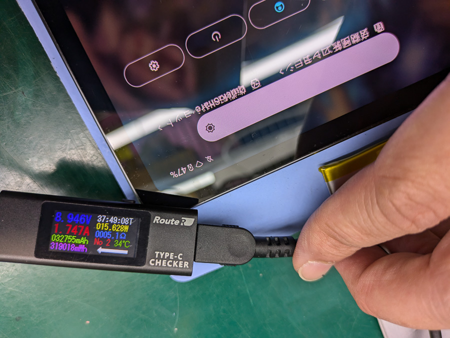 表示やタッチに問題は見られませんが、お客様のご申告の通り「1時間充電をしても5%程度しか充電が増えない」という症状が確認されました。