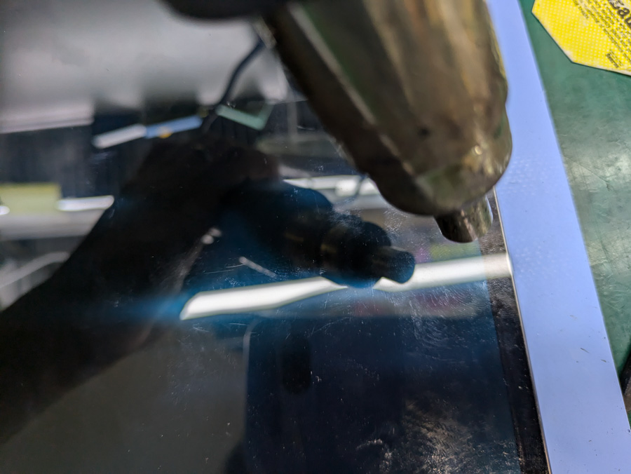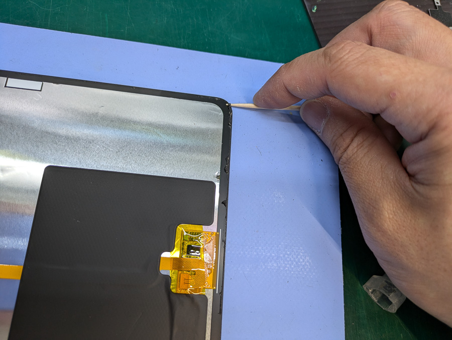 ヒートマットとヒートガンを併用して、画面を予熱して、内部のテープの貼り付きを弱くします。