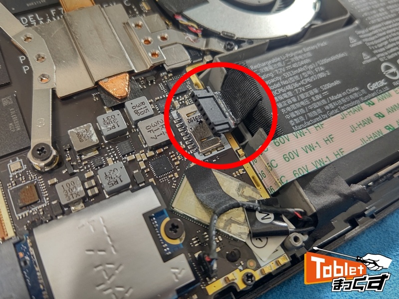 シールドを取り外せたら、バッテリーコネクタの接続を外します。このとき、スパッジャーでコネクタをソケットからそっと押し出すと外しやすいです。