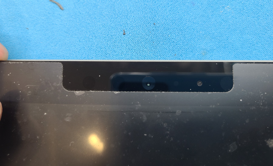 外周をぐるっと剥がしたら画面を持ち上げます。ホコリが大量に侵入してしまっていますね。