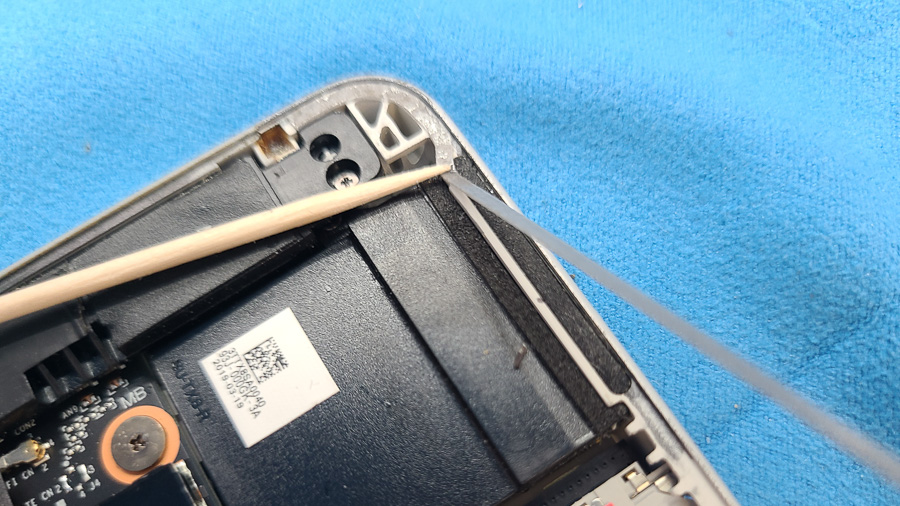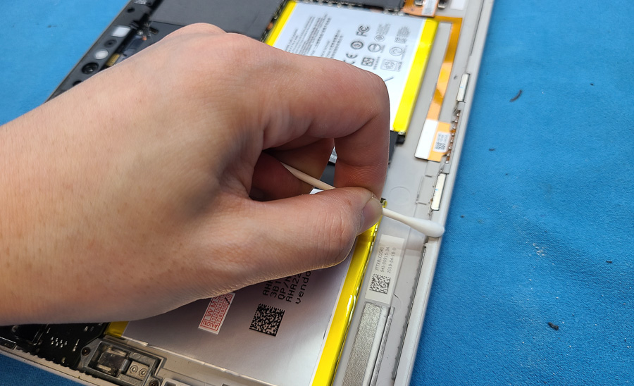 強力な両面テープで張り付いているので本体を温めながら、専用のカードを差し込んでテープを切るように開いていきます。今回は膨張により大きな隙間が空いているのでそこを起点に剥がしていきます。